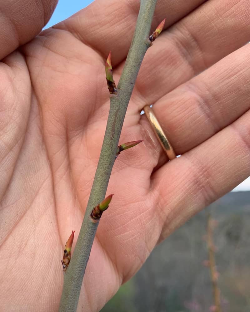 Today let’s learn about the difference between a fruit bud and a leaf bud. There are 2 types of buds on a blueberry plant. The sharp pointed tips of the leaf bud are now starting to peek their tips out.